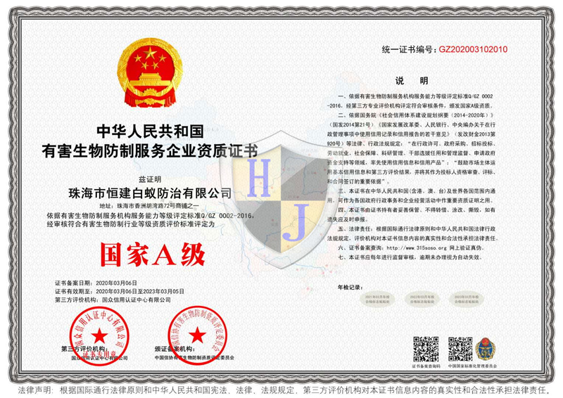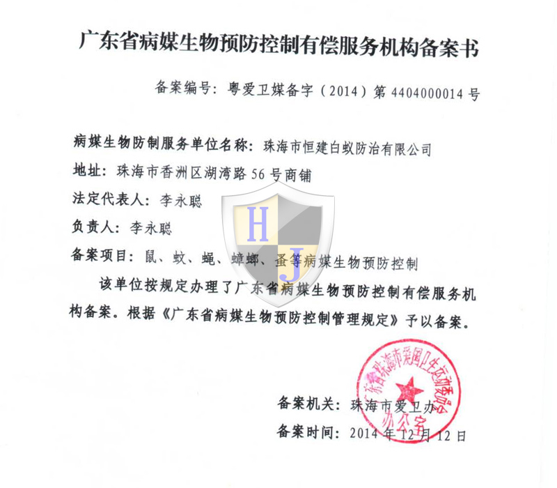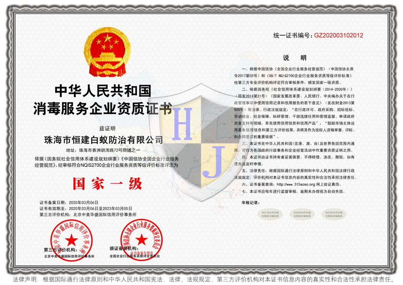 經(jīng)多年專(zhuān)注誠(chéng)信經(jīng)營(yíng),公司獲得國(guó)家級(jí)有害生物防制A級(jí)資質(zhì)證書(shū)、國(guó)家級(jí)消毒一級(jí)資質(zhì)證書(shū),通過(guò)廣東省病媒生物預(yù)防控制備案、市愛(ài)衛(wèi)辦頒發(fā)病媒生物備案證明、廣東省守信用重合同企業(yè)榮譽(yù)、城市蟲(chóng)害行業(yè)等多項(xiàng)資質(zhì)。