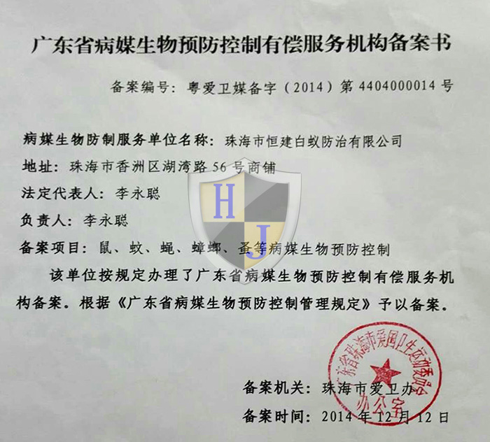 珠海市恒建白蟻防治有限公司成立于2005年10月,注冊(cè)資金人民幣300萬(wàn)元,本地老牌公司。本公司專(zhuān)注于白蟻防治、滅鼠、殺蟲(chóng)、疫情消毒防控、防蛇、其它有害生物病媒控制和預(yù)防管理等。