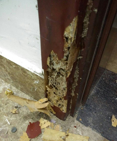 當日,李師傅在張女士家中發現,她家里的木質家具較多。據介紹,她入住該房屋才兩年時間,前幾日中午回到家時,不經意間用手觸摸到自家房門套表皮,感覺有點異樣,用手指使勁一摁,居然癟了下去。接著撕開門套表皮發現,一大堆白蟻正在啃噬著門框,嚇了張女士一大跳。